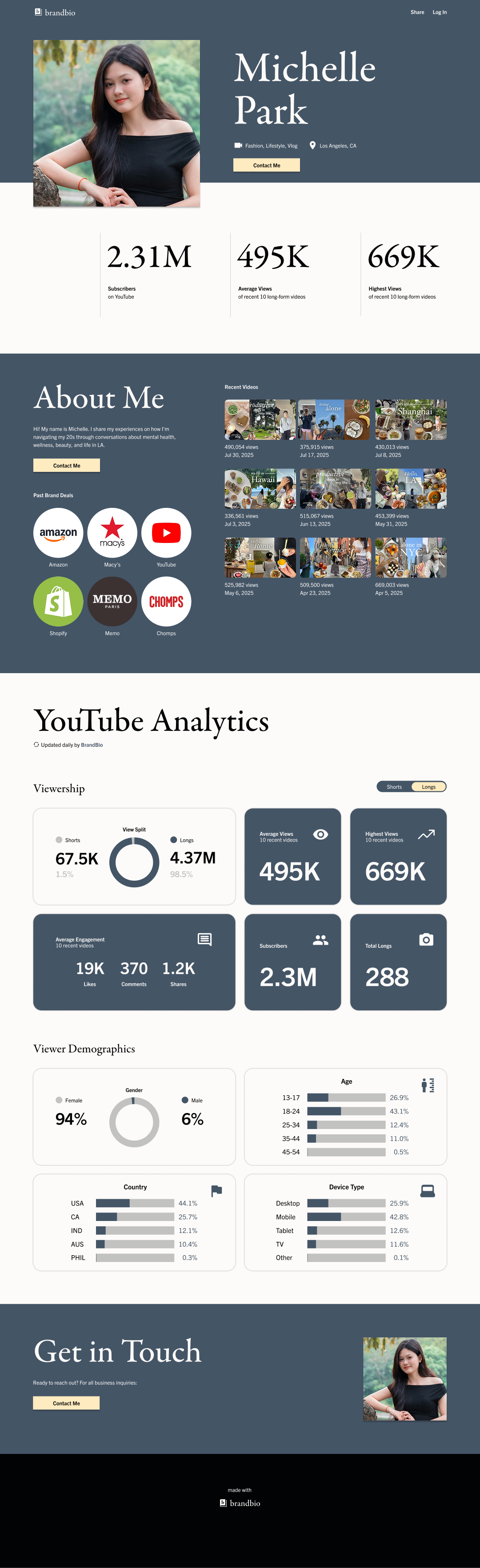 Your brand bio introduces you and highlights your best metrics to make brands instantly lean in.